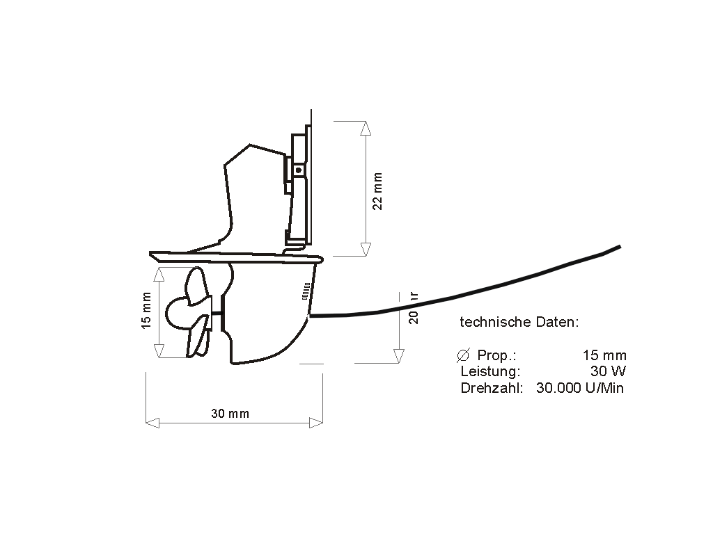 Vorbildgetreue Nachbildung eines Z-Antriebes wie sie bei vielen Sportbooten mit Baujahr ab ca. 1970 eingesetzt werden. Der Lenkwinkel ist relativ klein, reicht aber üblicherweise zum Manövrieren auf engem Raum aus. Durch die kleine Bauweise ist der Antrieb recht leise und erstaunlich kraftvoll. Das Aufhängung wird flach auf den Rumpf aufgeklebt, nur für die Flexwelle und die Lenkstange sind Löcher im Rumpf notwendig.