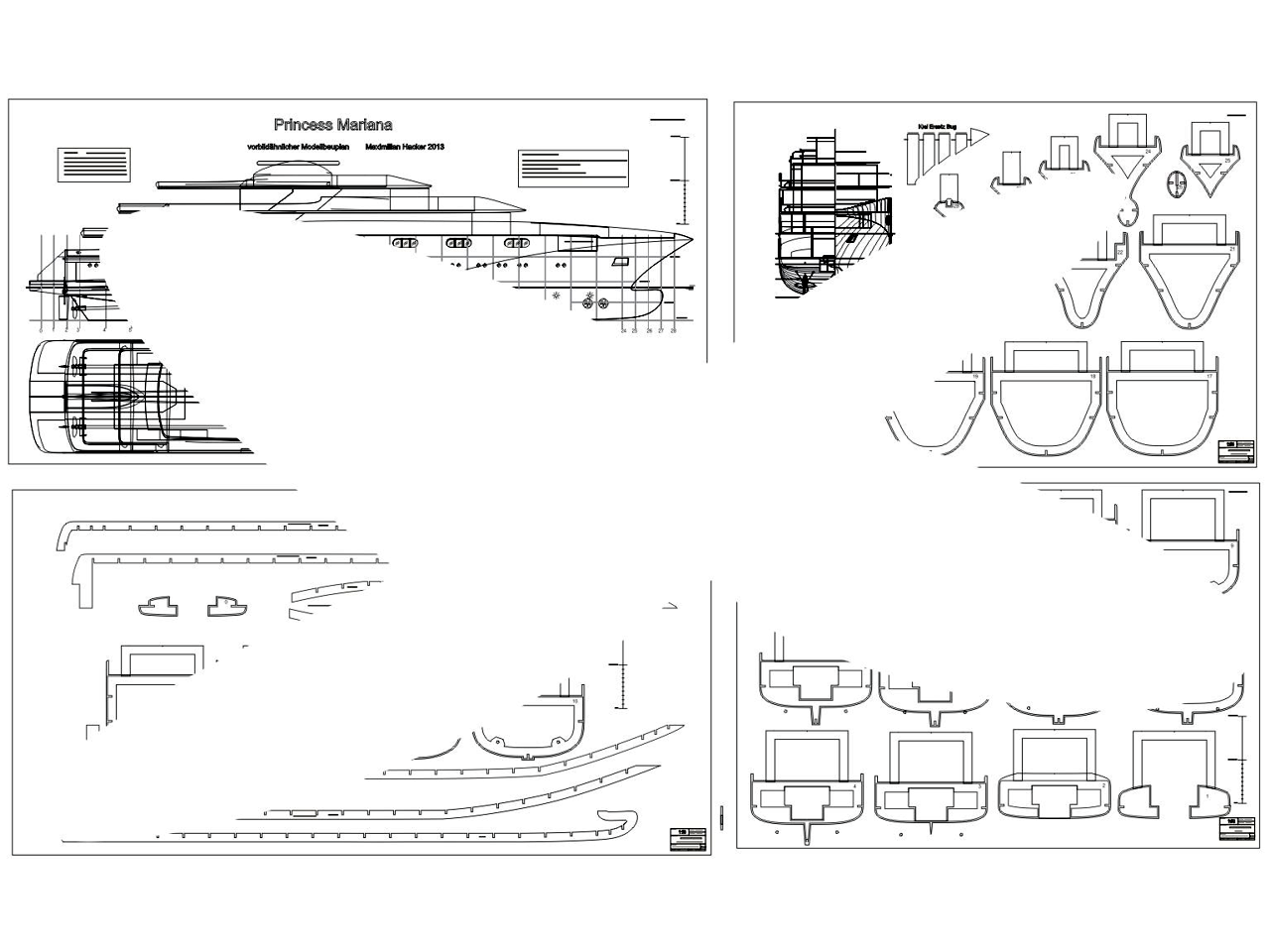 Es gibt viele große Megayachten, aber die Princess Mariana (inzwischen wurde sie in Pegasus umbenannt) ist etwas ganz Besonderes. Ein unverwechselbares, aber dennoch in sich stimmiges Design, vereint mit erstaunlichem Luxus und besonderen Einrichtungen, wie zum Beispiel einem flutbaren Dock auf Wasserlinie für das großzügige Tenderboot. Dazu eine ausklappbare Plattform, ein Wasserskiboot in einem Bugraum, mehrere Whirlpools, ein Hubschrauberlandeplatz. Ein majestätischer Anblick und als Modell wie geschaffen für zahlreiche Sonderfunktionen. Der Plan zeigt jeden Spant einzeln, Leistenbeplankung ist bei dem komplexen Rumpf jedenfalls notwendig. Die Aufbauten sind nur in den Ansichten zu sehen und ohne Details wie Fenster, Türen, Gitter, etc. Im Internet findet man viele hochauflösende Bilder dieser Yacht, so dass ein guter Modellbauer kein Problem haben wird die Details selbst zu erarbeiten.
